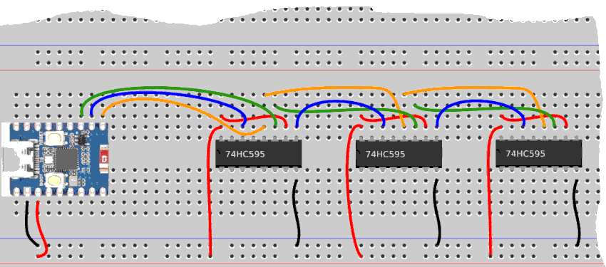 Avec ce montage, on peut gérer 24 sorties supplémentaires. Il n'y a pas de limite au nombre de registres 74HC595 pouvant être chaînés.