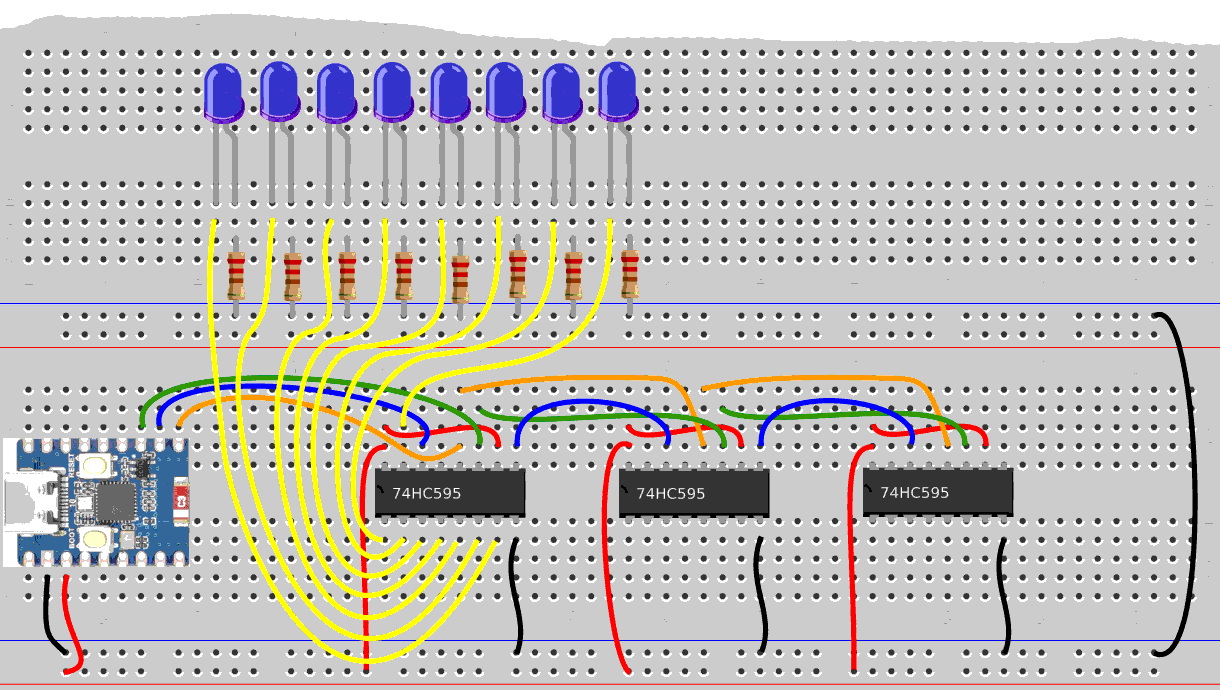 Voici le câblage de huit LEDs connectées à un registre 74HC595: