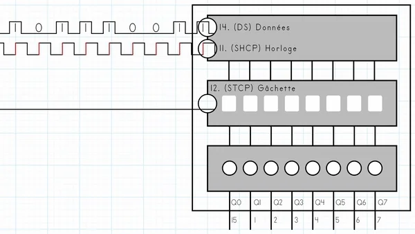 Voici comment le composant 74HC595 traite les signaux transmis par un micro-contrôleur: