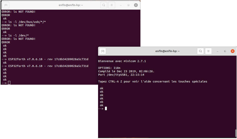 Ici, sous Linux, nous avons ouvert deux terminaux Minicom: