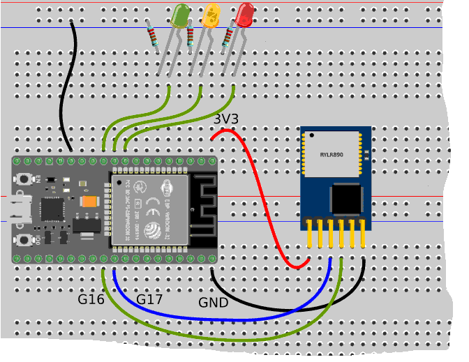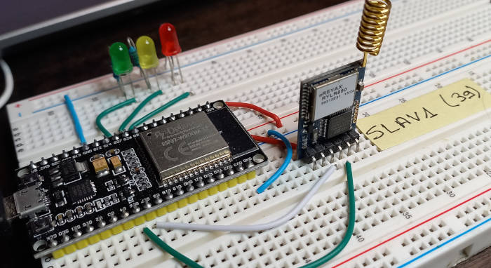 Et ce sont ces séquences, et elles seules qui seront transmises et reçues par les transmetteurs LoRa. Voici le montage des LEDs et du transmetteur LoRa sur notre plaque d'essai nommée SLAV1: